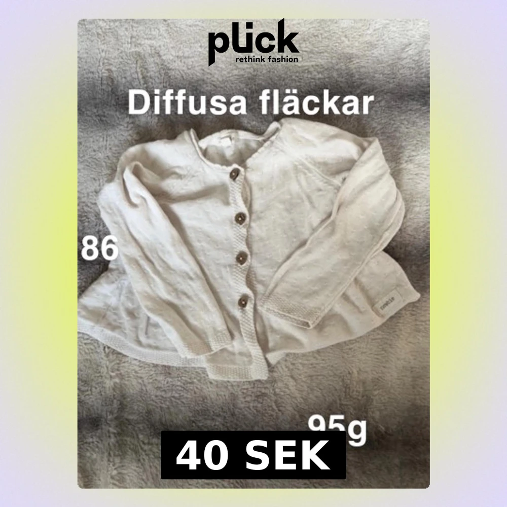 Söt vit kofta från Newbie i storlek 86. Koftan har lång ärm, rund hals och fem träknappar framtill. Perfekt att slänga över en t-shirt för extra värme.🌸Diffusa fläckar. Storlek 86