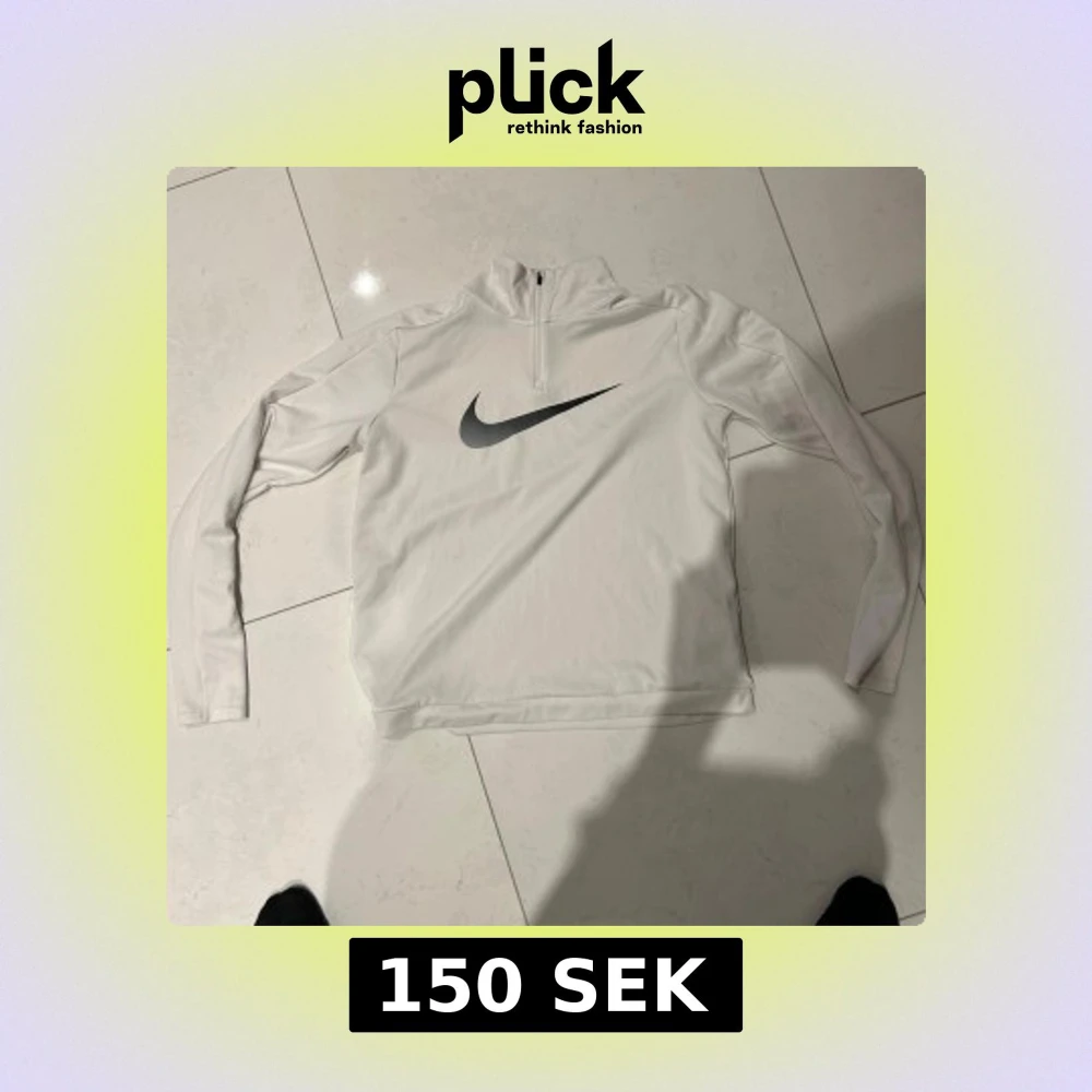 Säljer en vit långärmad träningströja från Nike med halv dragkedja och stor svart logga på bröstet. Tillverkad i Dri-FIT-material som andas och passar perfekt till träning eller sportaktiviteter.