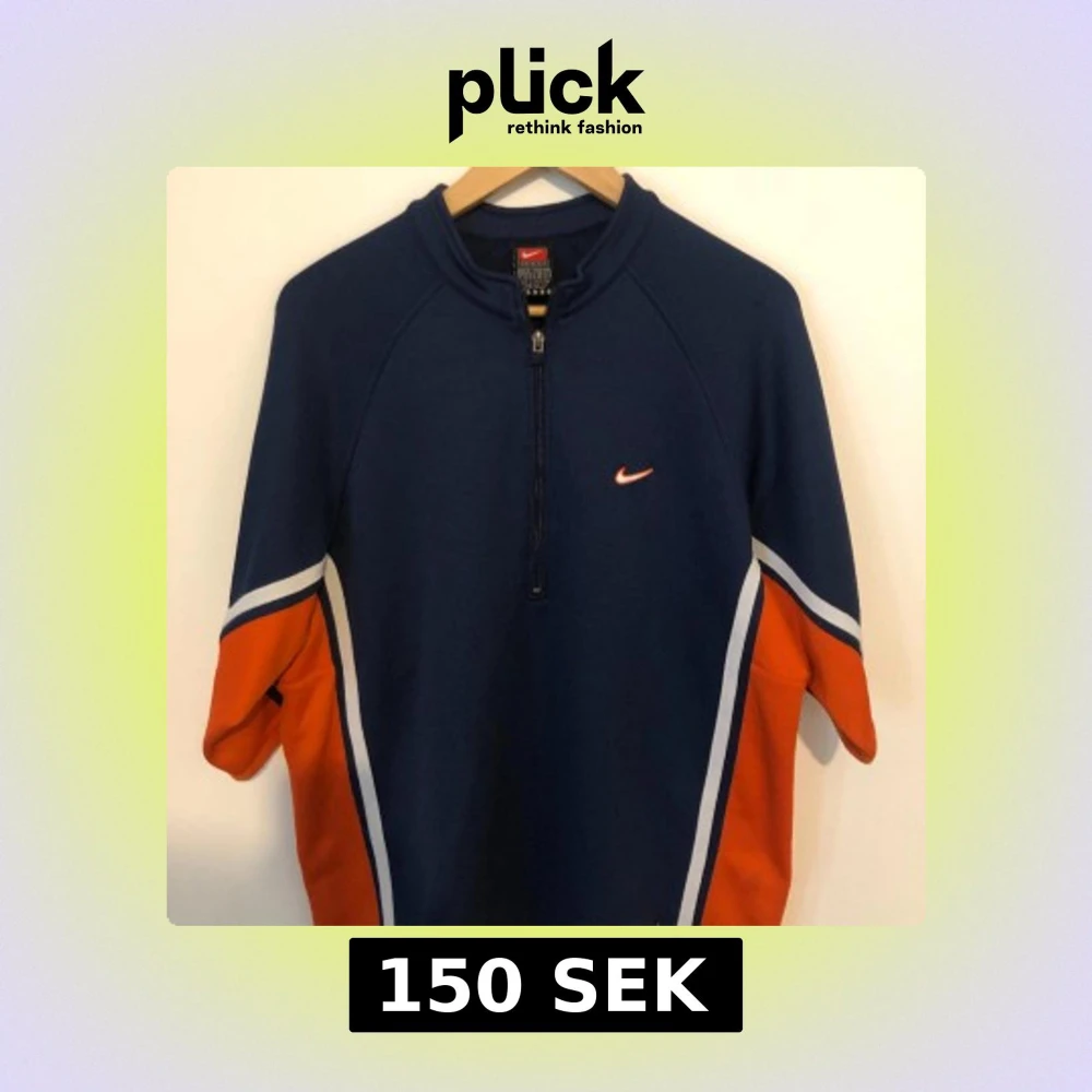 Sportig marinblå tröja från Nike med orange och vita detaljer längs ärmarna. Tröjan har half zip framtill och korta ärmar, perfekt för träning eller chill. Snygg logga på bröstet och cool retrostil.