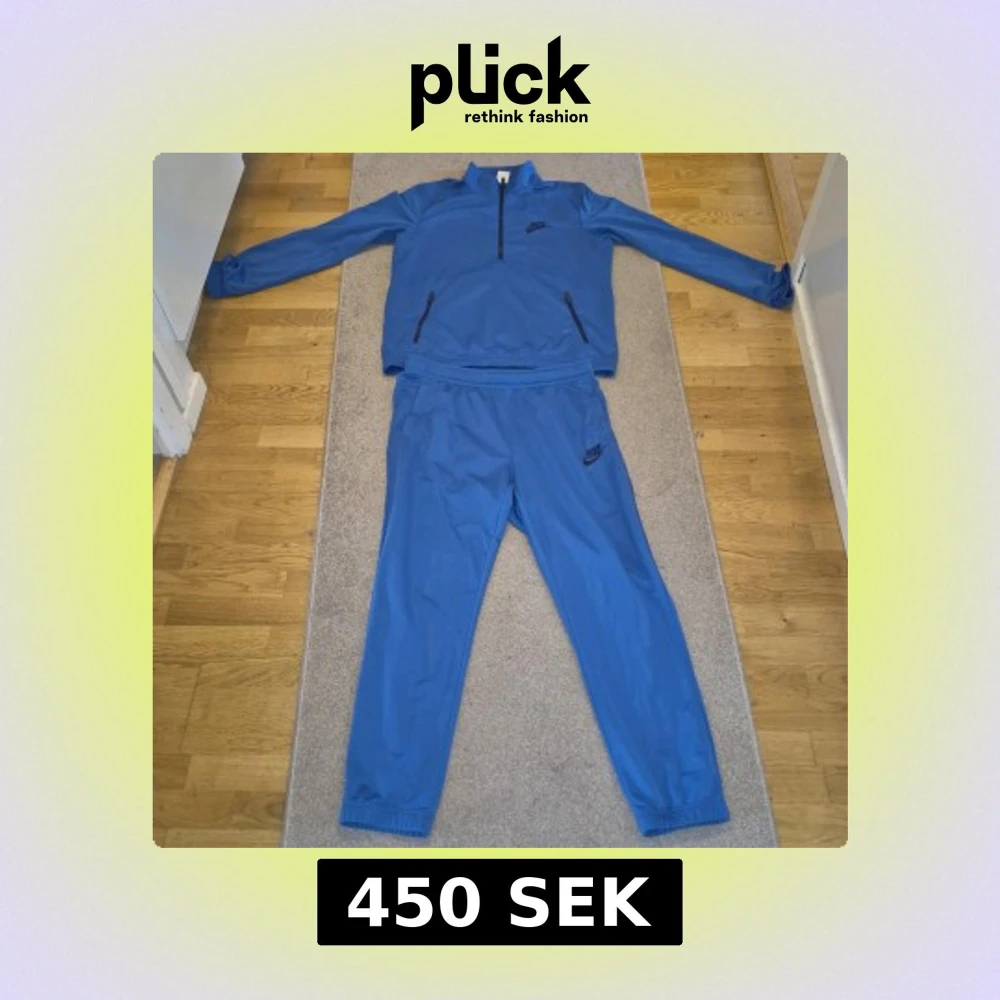 Säljer ett par blå träningsbyxor från Nike med resår i midjan och vid bensluten. Byxorna har en sportig look och är tillverkade i ett lätt syntetmaterial som passar perfekt för träning.