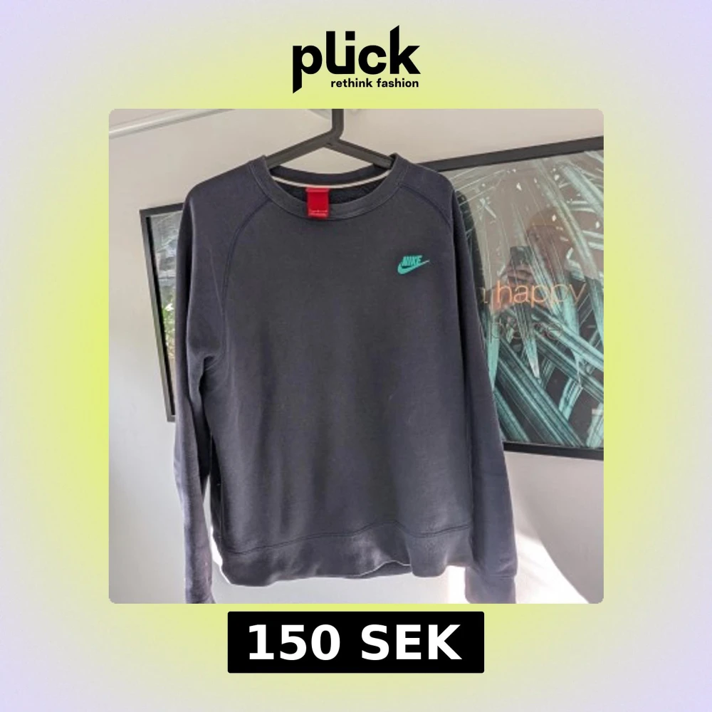 Säljer en mörkblå tröja från Nike med turkos logga på bröstet. Tröjan har långa ärmar och en praktisk dragkedjeficka på ärmen. Perfekt för en sportig look eller avslappnad stil.