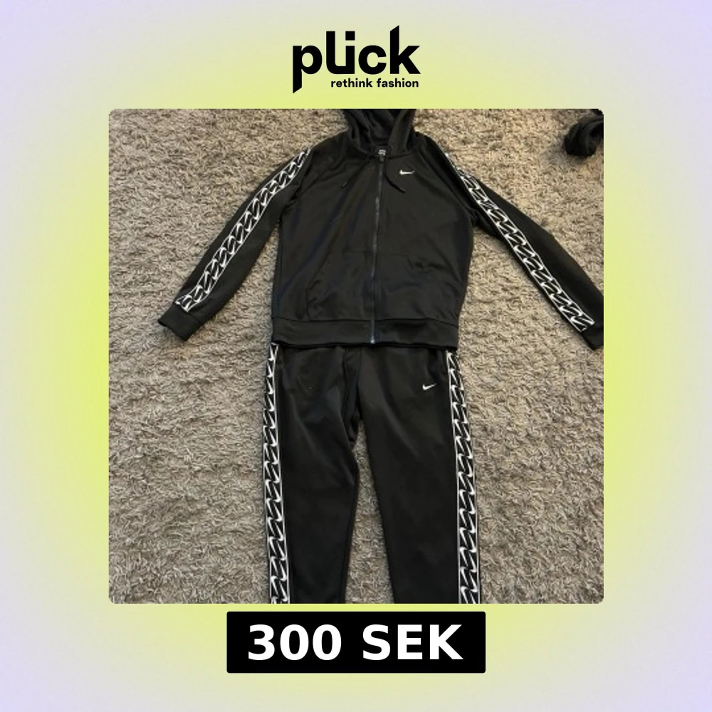 Säljer ett svart träningsset från Nike med dragkedja och huva. Setet har vita mönster längs ärmar och ben samt små Nike-loggor. Perfekt för träning eller en avslappnad dag.