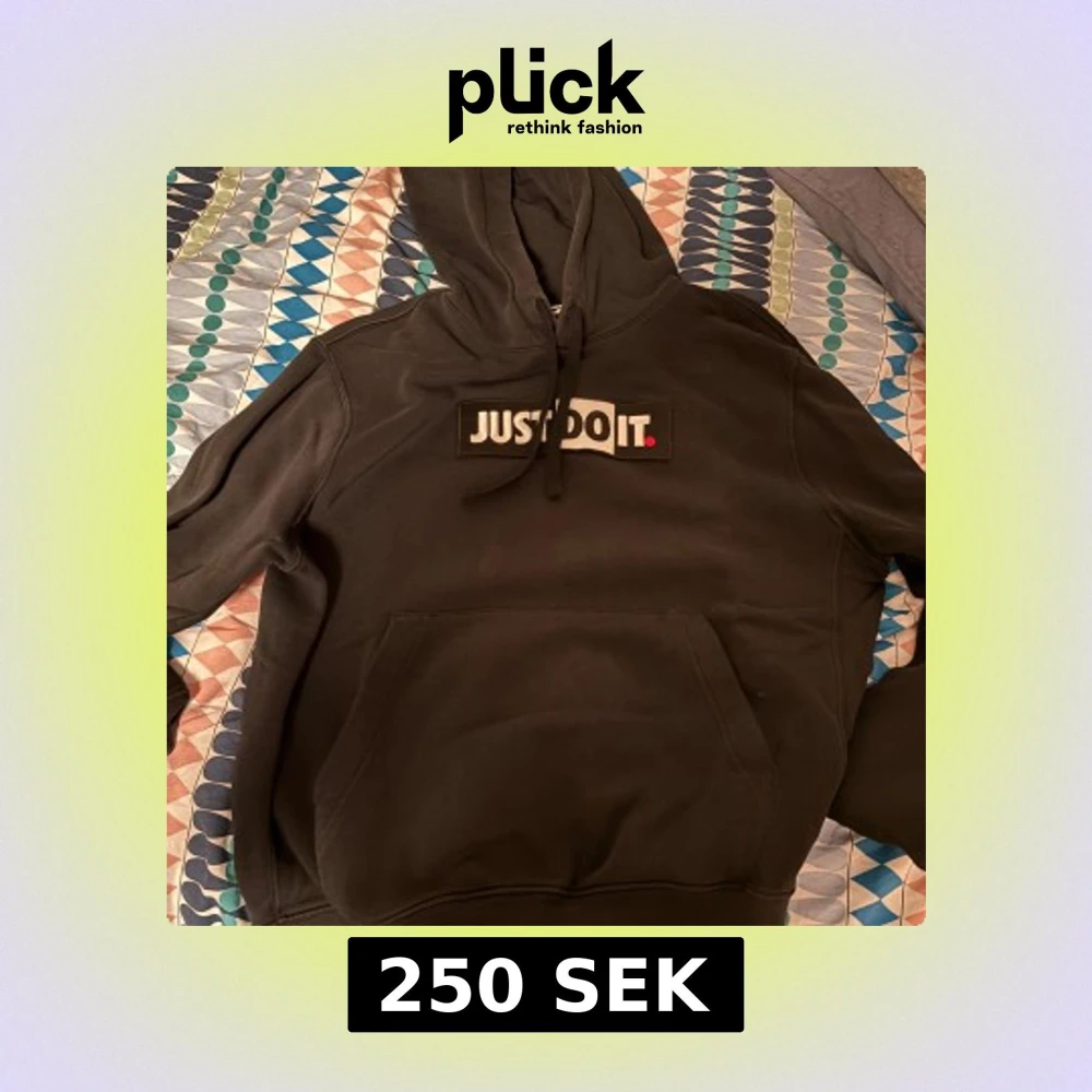 Säljer en svart hoodie från Nike med texten 'Just Do It' på bröstet. Den har en klassisk känguruficka och justerbar huva med dragsko. Perfekt för en avslappnad stil.