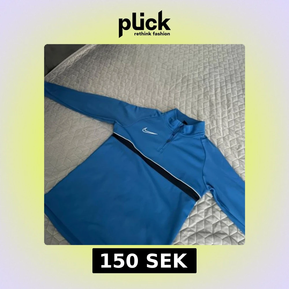Blå långärmad Nike Dri-Fit tröja med svart och vit rand över bröstet. Tröjan har en half zip-dragkedja vid halsen och är tillverkad i ett lätt, syntetiskt material som andas. Perfekt för träning eller sportiga dagar.