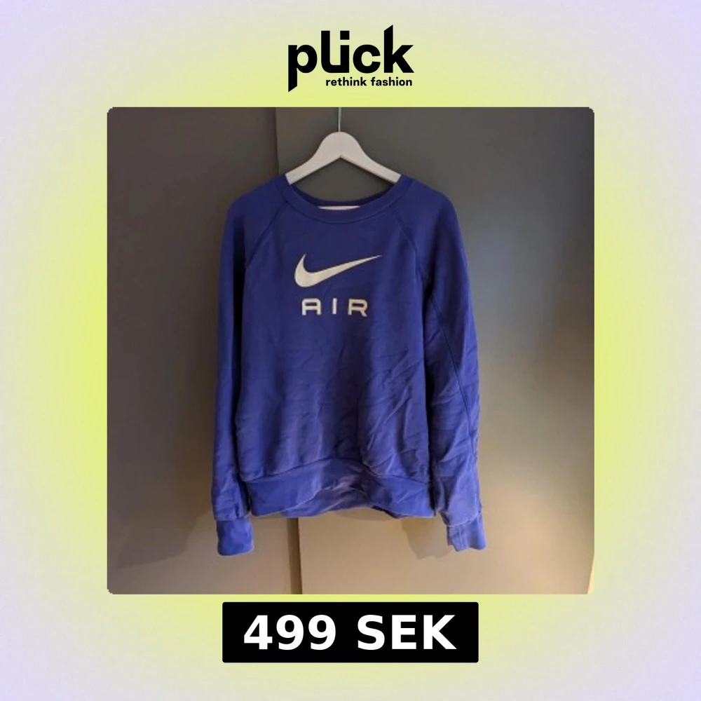 Säljer en blå sweatshirt från Nike med det klassiska Nike Air-logotypen i vitt på framsidan. Tröjan har långa ärmar och en rund halsringning. Perfekt för en sportig look eller avslappnade dagar.