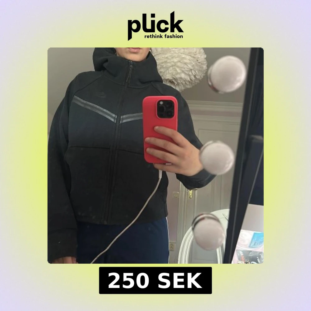 Svart kofta från Nike Tech med dragkedja hela vägen, hög krage och huva. Jackan har två silvriga reflexränder över bröstet och diskret Nike-logga på vänster sida. Tillverkad i polyester och har en sportig, loose passform. Perfekt för dig som gillar streetwear och sportig stil. Säljs ENDAST PGA ingen användning ☺️ Skit snygg men använder inte längre ‼️☺️ Andvänt 3 gånger