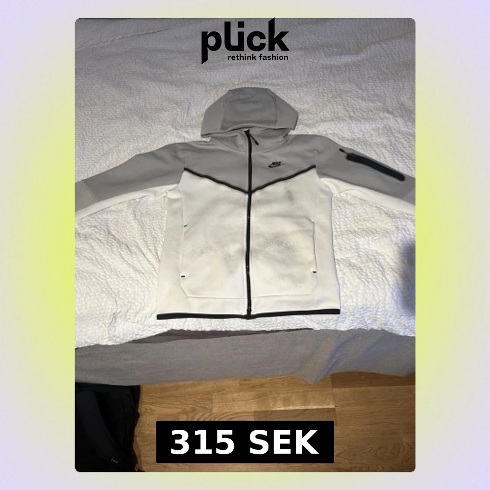 Tjena! Jag säljer en grå vit Nike tech fleece då är allt för liten, den har tyvärr små små prickar från när jag råkade tvätta den med fel tvättmedel, annars är det rätt så fräck faktiskt och är nästan helt ny, skriv gärna om ni har några funderingar!💯🔥