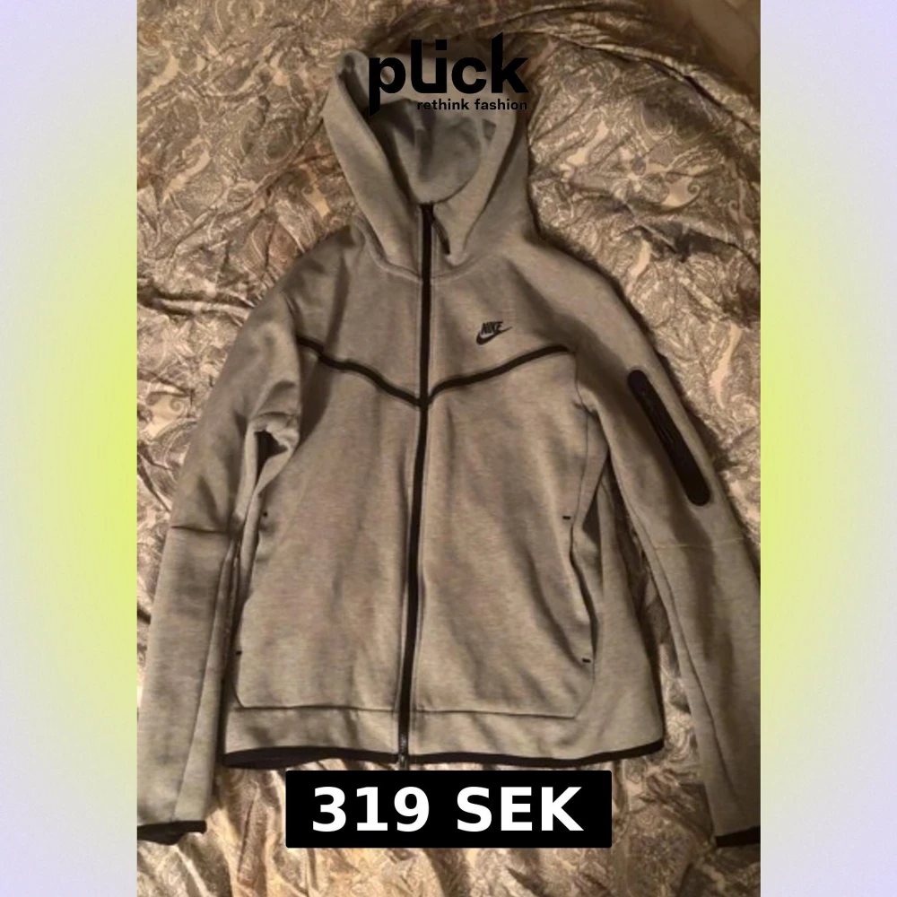 Grå hoodie från Nike i medium med hel dragkedja och svart Nike-logga på bröstet. Tröjan har huva, svarta detaljer längs sömmarna och en ficka med dragkedja på ärmen. Perfekt för chill eller träning, riktigt clean look.