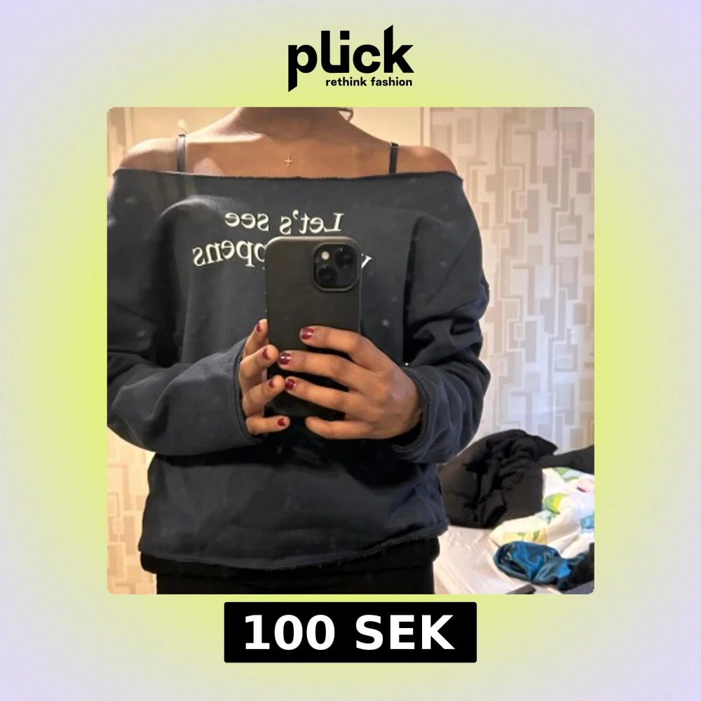 Säljer en mörkblå sweatshirt med offshoulder-modell och vit text framtill, tröjan har långa ärmar och en avslappnad passform,