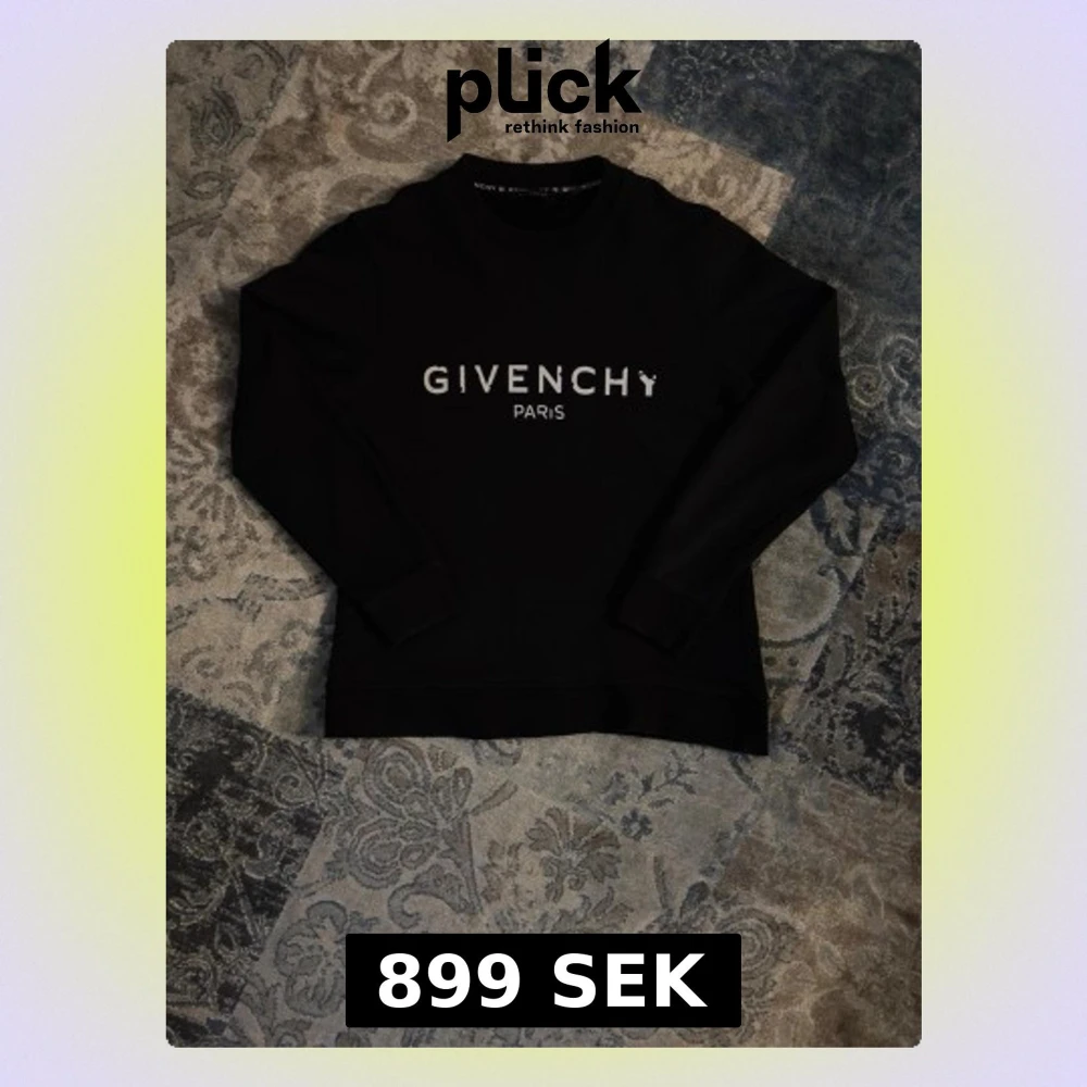 Svart sweatshirt från Givenchy med vit logotyptext 'GIVENCHY PARIS' på bröstet. Tröjan har rund halsringning, långa ärmar och ribbade muddar. Perfekt för en stilren och trendig look. Det står L på lappen men passar mindre, DM för måttet