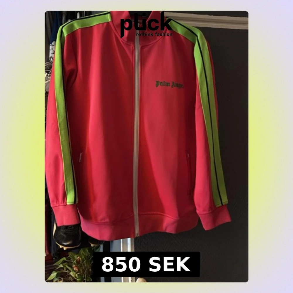 Säljer en snygg rosa track jacket från Palm Angels med limegröna ränder längs ärmarna och dragkedja framtill. Jackan har hög krage, två fickor och logga på bröstet. Perfekt för dig som gillar streetwear och vill sticka ut. Priset kan sönkas vid snabb affär