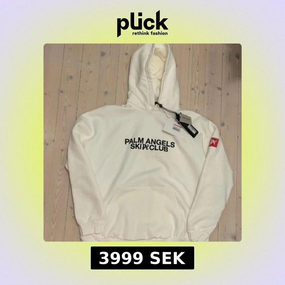 Säljer en clean helt ny vit hoodie från Palm Angels med svart text 'Palm Angels Ski Club' på bröstet och röd patch på ärmen. Klassisk känguruficka, huva och ribbade muddar. Perfekt för dig som gillar streetwear och vill sticka ut med en exklusiv look.