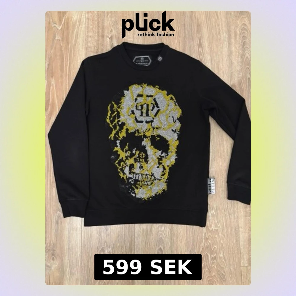 Cool svart sweatshirt från Philipp Plein med ett stort döskalletryck i gult och vitt på framsidan. Tröjan har rund hals, långa ärmar och ribbade muddar. Märkesdetaljer syns både på etiketten och i trycket.