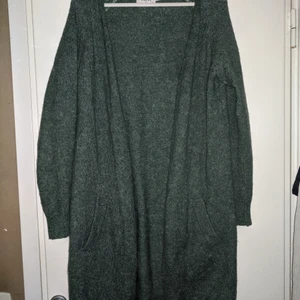 Lång skön kofta, inga knappar, vill man stänga den får man använda skärp el brosch. Jag är 161 cm onde går till knävecken på mig