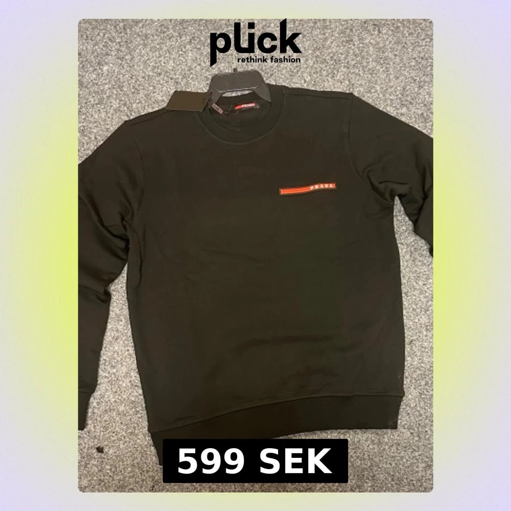 Svart sweatshirt från Prada med rund hals och lång ärm. Diskret röd logga på bröstet ger en clean och stilren vibe. Tröjan har ribbade muddar vid ärmslut och nederkant. Perfekt för dig som gillar exklusiva märken och enkel design.