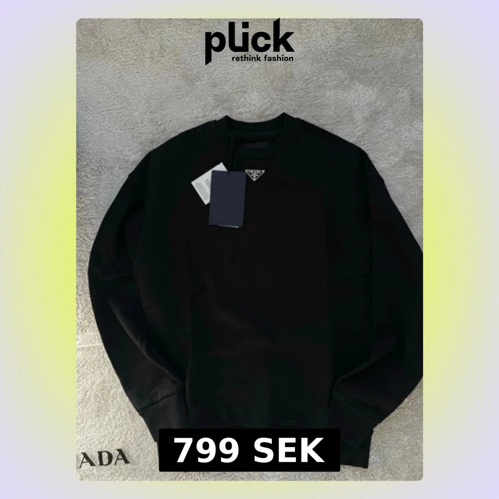 Säljer en svart sweatshirt från Prada med klassisk rund hals och diskret metallogo framtill. Tröjan har långa ärmar och ribbade muddar vid ärmslut och nederkant. Tillverkad i mjuk bomull för en clean och stilren look.