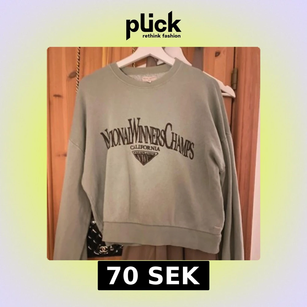 Säljer en ljusgrön sweatshirt med brunt tryck 'National Winners Champs California' framtill. Tröjan har rund halsringning och långa ärmar. Perfekt för en avslappnad stil.