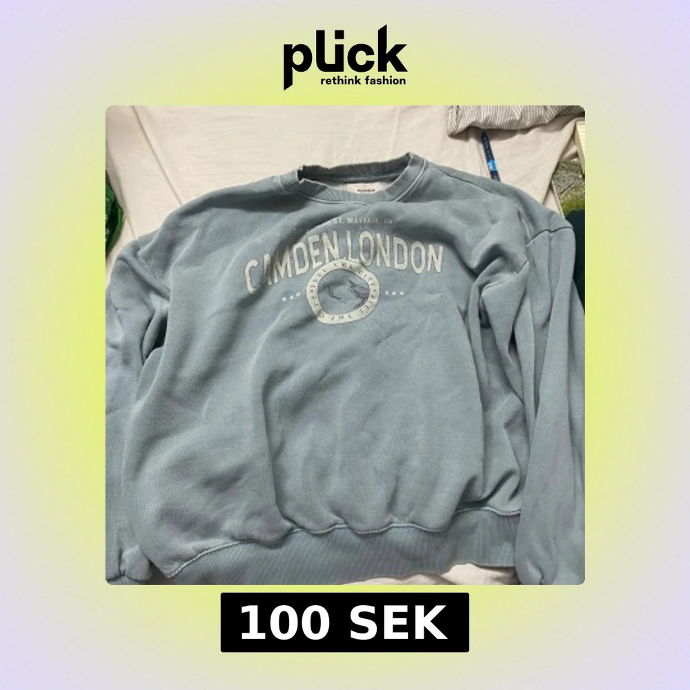 Blå sweatshirt från Pull&Bear med tryck 'Camden London' och grafiskt emblem på bröstet. Tröjan har rund hals, långa ärmar och ribbade muddar. Perfekt för en chill och avslappnad stil.
