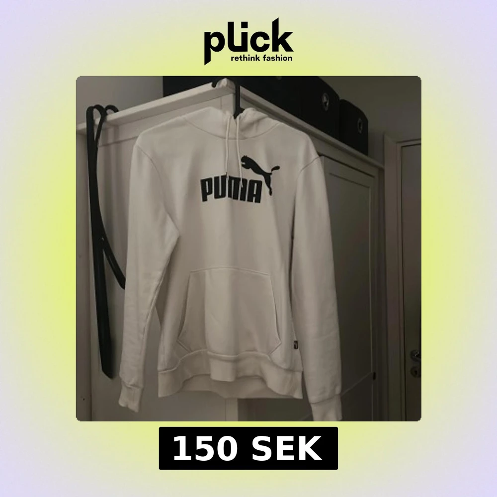 Säljer en stilren vit hoodie från Puma med svart logga och text på bröstet. Tröjan har huva med snörning, magficka och långa ärmar. Perfekt för dig som gillar sportig och avslappnad stil.