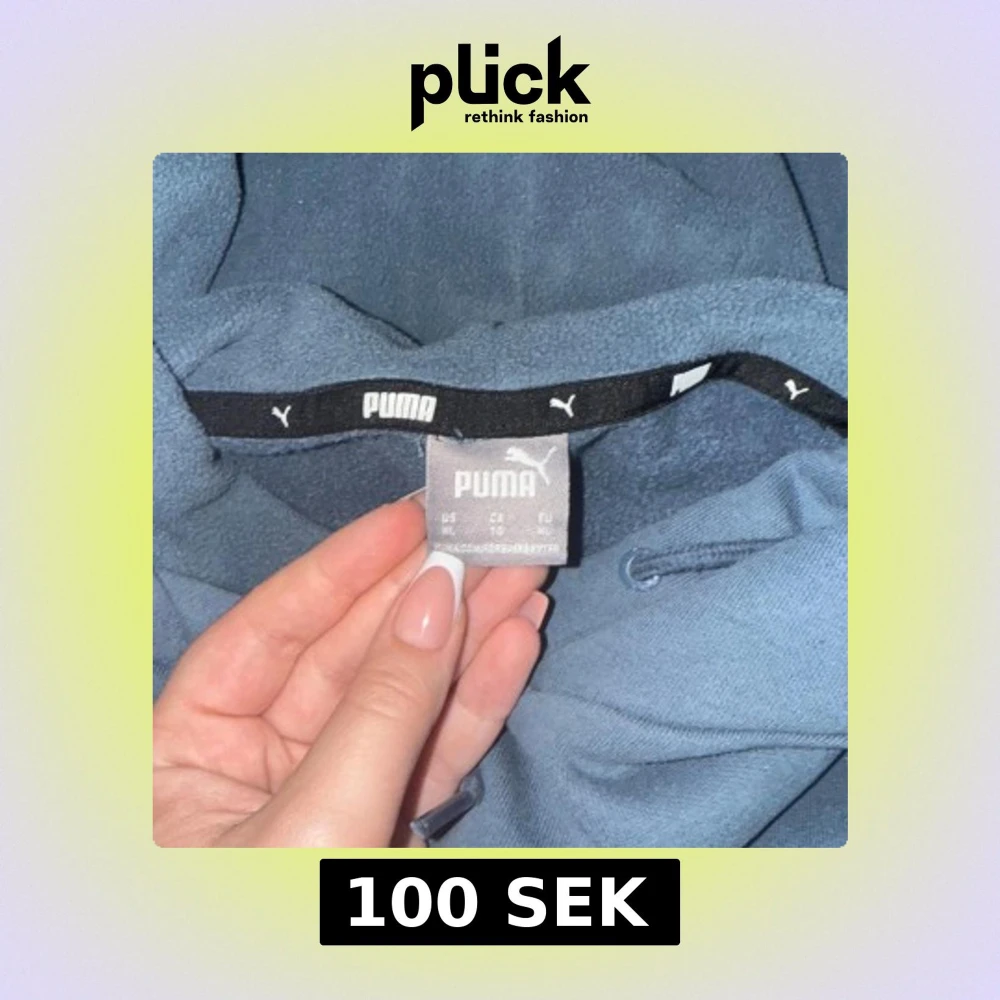 Säljer en blå hoodie från Puma med klassisk vit logga på bröstet. Tröjan har huva med snörning och en stor magficka framtill. Perfekt för chill dagar eller när du vill ha en sportig look. Materialet är mjukt och skönt, troligtvis bomullsmix. Passar som S