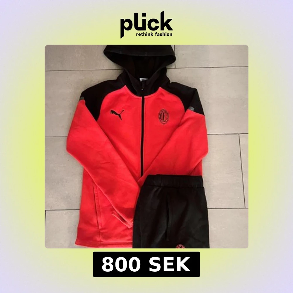 Säljer en röd och svart hoodie från Puma med AC Milan-logga på bröstet. Tröjan har huva, dragkedja och långa ärmar med svarta axelpartier. Perfekt för dig som älskar fotboll och vill ha en sportig look.