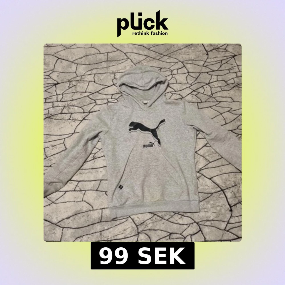 Säljer en ljusgrå hoodie från Puma med stor svart logga på bröstet. Tröjan har huva och en stor magficka framtill. Perfekt för en avslappnad stil och enkel att matcha med det mesta.