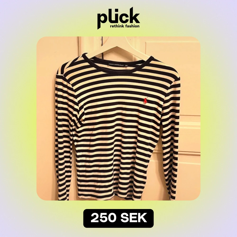 Säljer en snygg och klassisk randig tröja från Ralph Lauren i storlek M. Tröjan är mörkblå och vit med långa ärmar och har det ikoniska röda Ralph Lauren-märket på bröstet. Perfekt för både vardag och lite mer uppklädda tillfällen. 🖤🤍