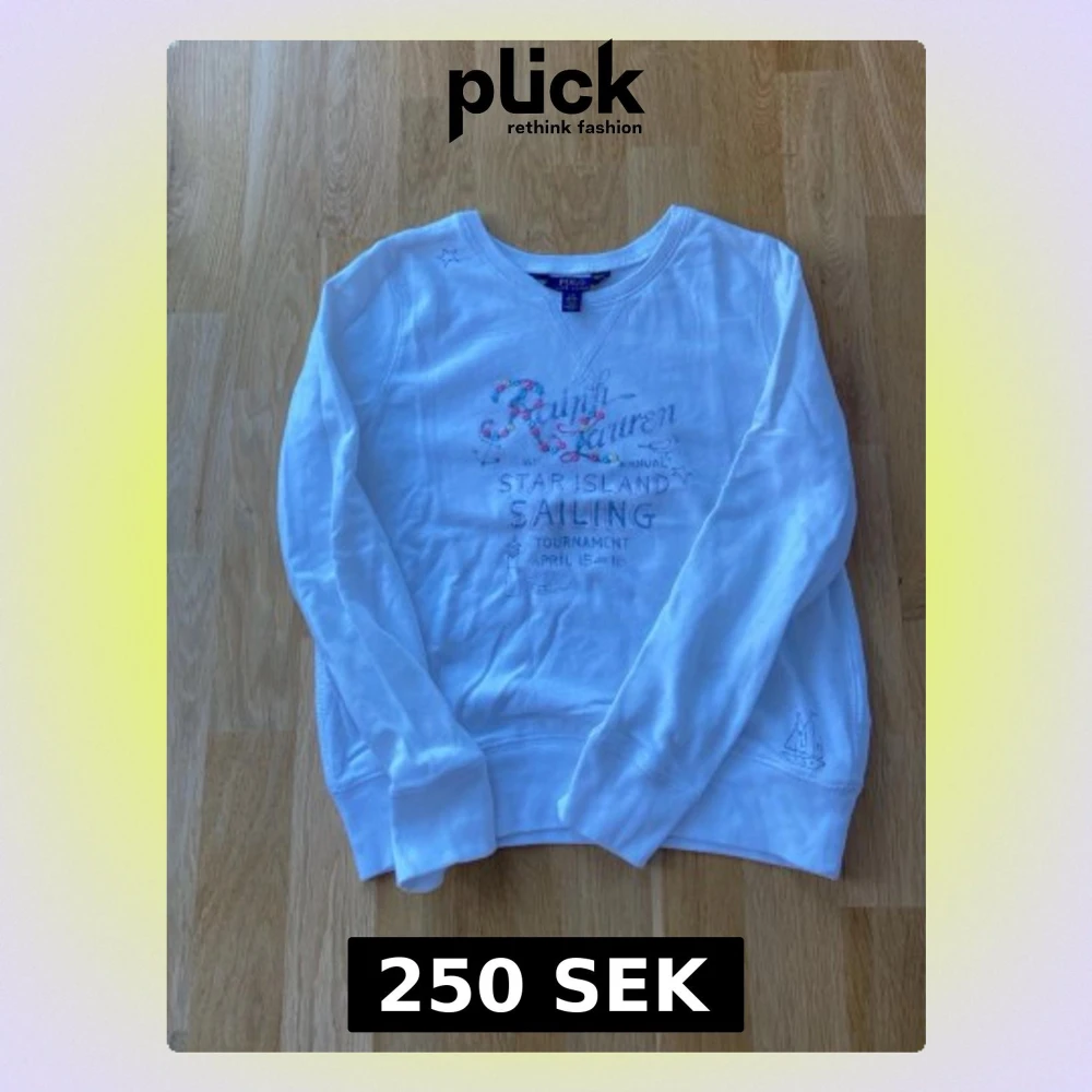 Vit sweatshirt från Polo Ralph Lauren med färgglatt tryck och text på bröstet. Tröjan har rund halsringning, långa ärmar och små broderade detaljer som stjärnor och segelbåt.