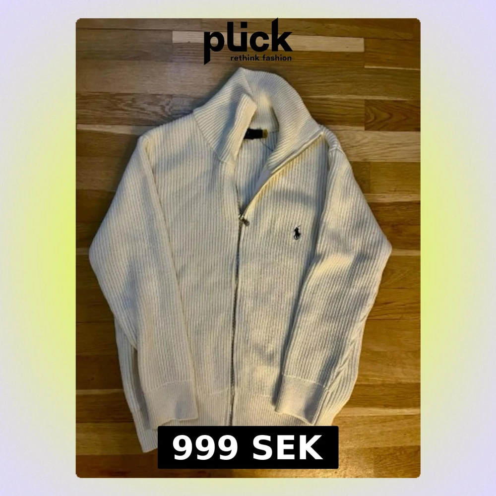 Vit ribbstickad ziptröja från Polo Ralph Lauren med hög krage och ikoniska marinblå loggan broderad på bröstet. Tröjan har långa ärmar, dragkedja framtill och är gjord i ett mjukt, tjockt material som känns lyxigt och bekvämt.