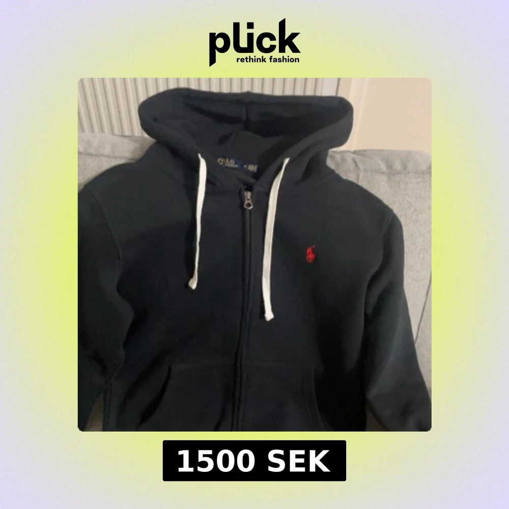 Säljer en stilren svart hoodie från Ralph Lauren med dragkedja och vit dragsko. Den har en röd logotyp på bröstet och är perfekt för en avslappnad look.