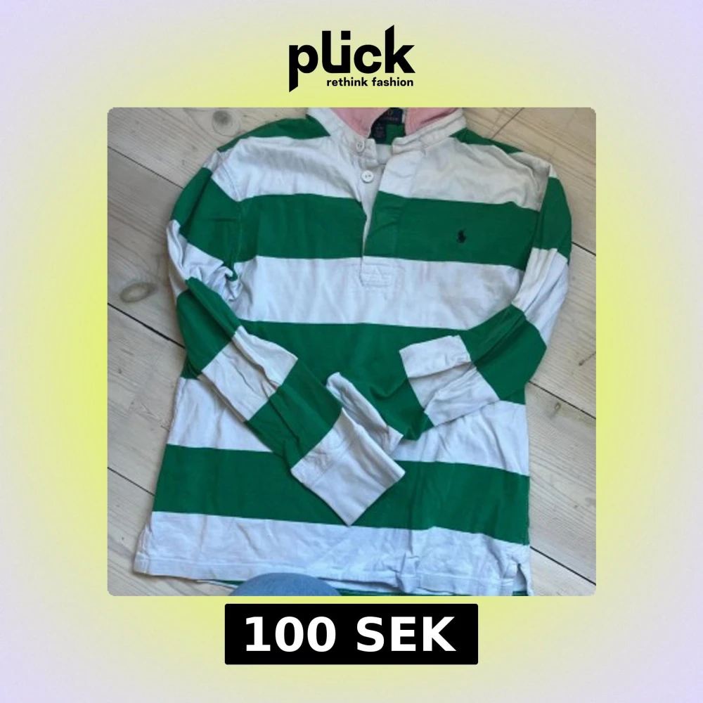 Säljer en klassisk långärmad pikétröja från Ralph Lauren med breda gröna och vita ränder, rosa insida på kragen och broderad logga på bröstet.