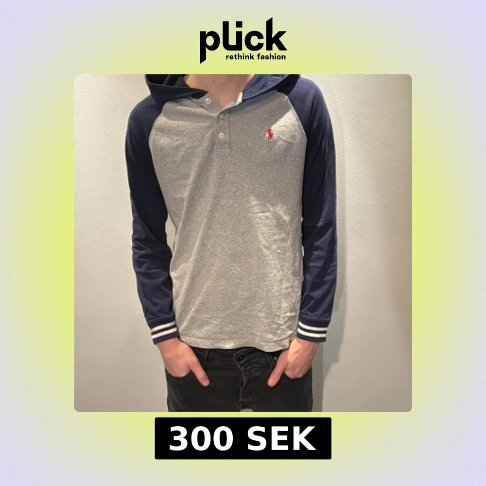 Snygg hoodie från Ralph Lauren med grå kropp och marinblå ärmar. Tröjan har huva, knappar vid halsen och en broderad röd logga på bröstet. På ena ärmen finns en stor vit 3:a. Muddar med vita ränder. Perfekt för en chill och sportig stil. Modellen är 186 cm och väger 70 kg