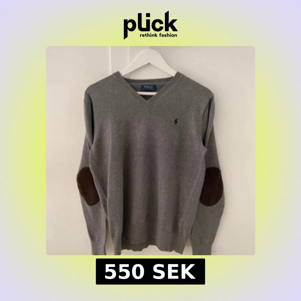 Säljer en stilren grå tröja från Polo med bruna armbågslappar. Tröjan har en v-ringad design och är tillverkad i 100% bomull. Perfekt för en klassisk och avslappnad look.