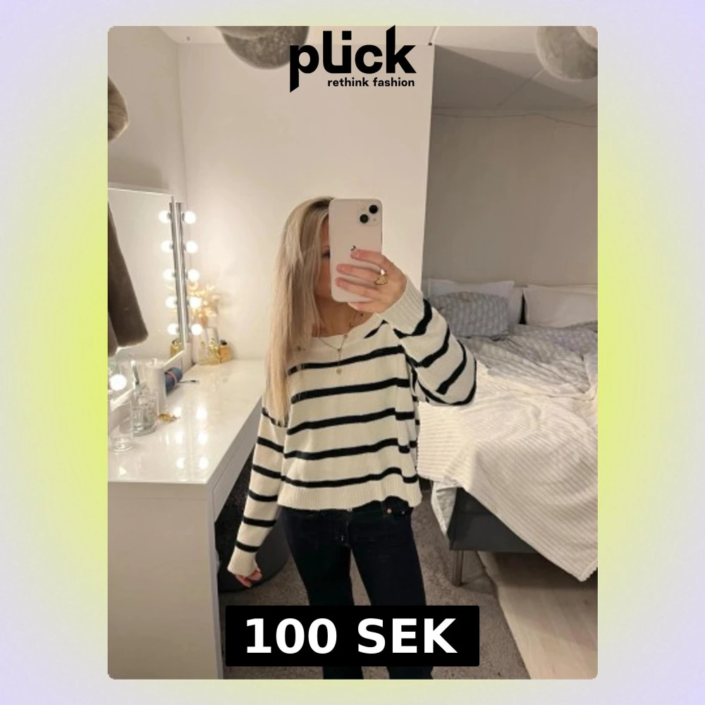 Säljer en mysig stickad tröja med svarta ränder på vit botten. Tröjan har en avslappnad passform, långa ärmar och ribbade muddar. Perfekt att slänga på sig för en chill look.