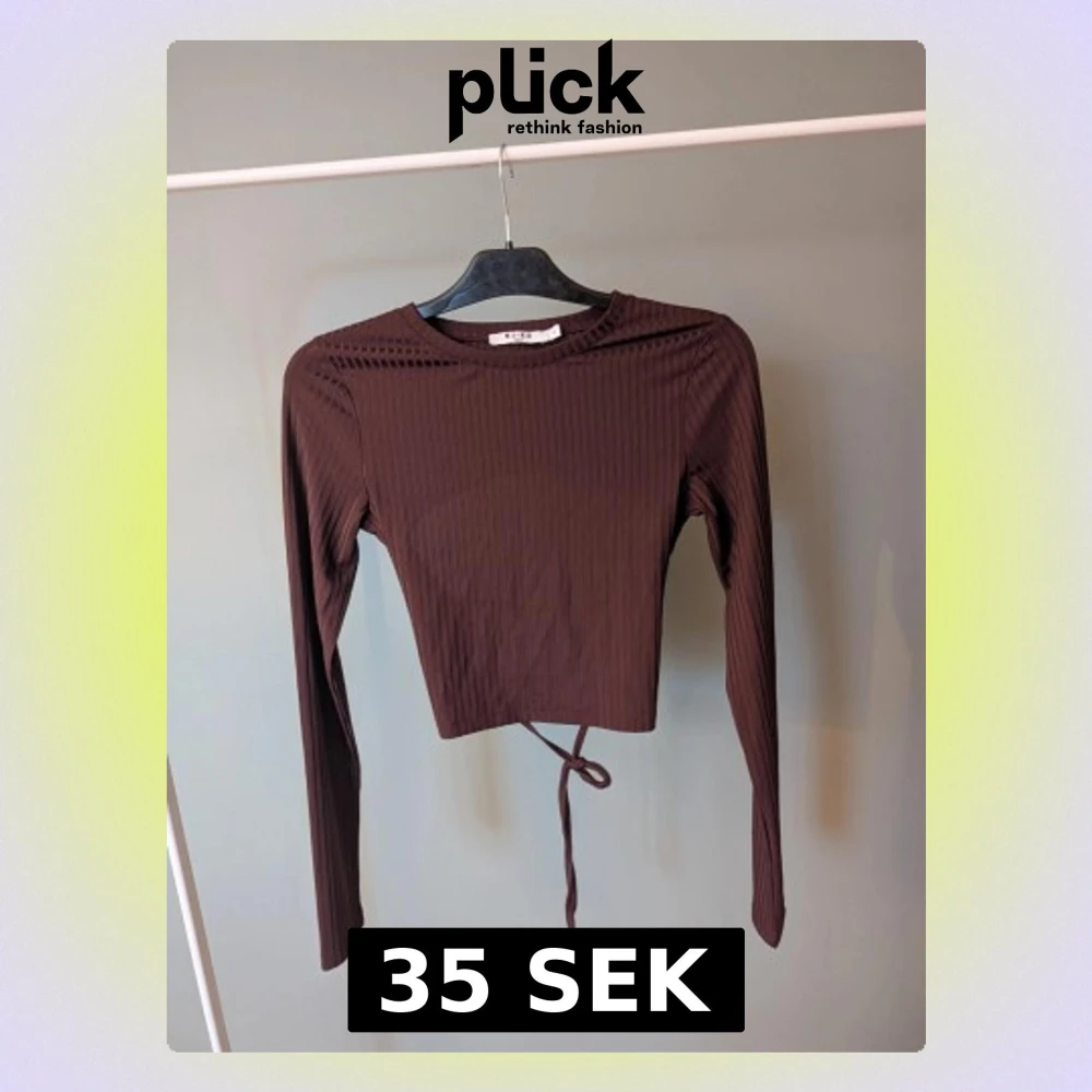 Säljer en brun croppad topp från NA-KD i storlek M. Toppen har ribbad struktur, långa ärmar och snörning i ryggen som ger en snygg detalj. Materialet är mjukt och stretchigt, perfekt för att styla med jeans eller kjol.