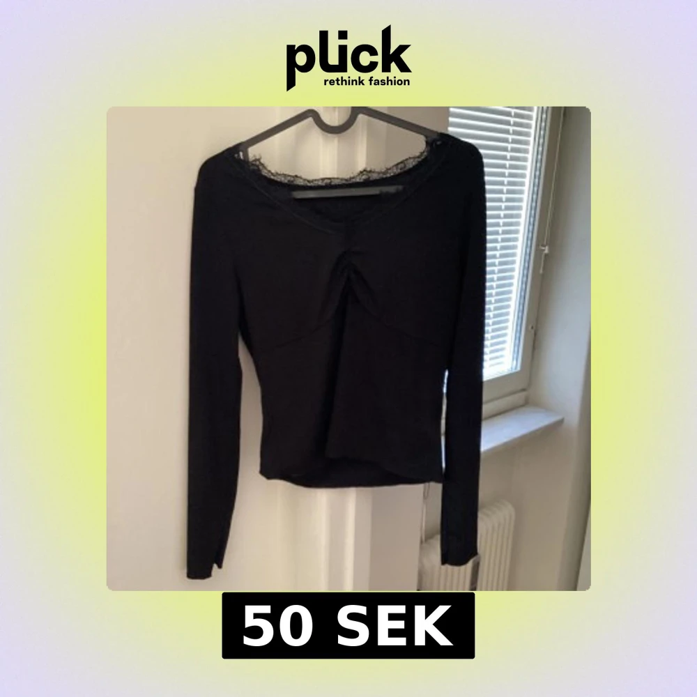 Säljer en svart ribbad topp från Shein med spetsdetaljer vid halsringningen. Toppen har långa ärmar och en snygg rynkning framtill. Perfekt för en stilren look.