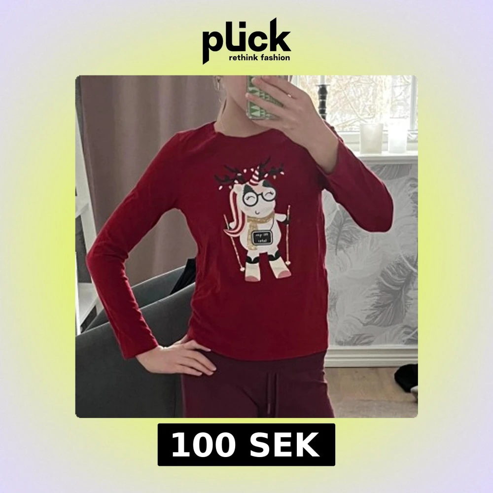 Säljer en röd långärmad tröja från H&M med ett gulligt enhörningsmotiv och texten 'ski you later'. Perfekt för vintern med sitt lekfulla tryck. Tröjan har en normal passform. Man kan ha den som vanligt tröja och en sovtröja. Kostade 160 kr när jag köpte den. Jätte fin och jätte skön. 😍