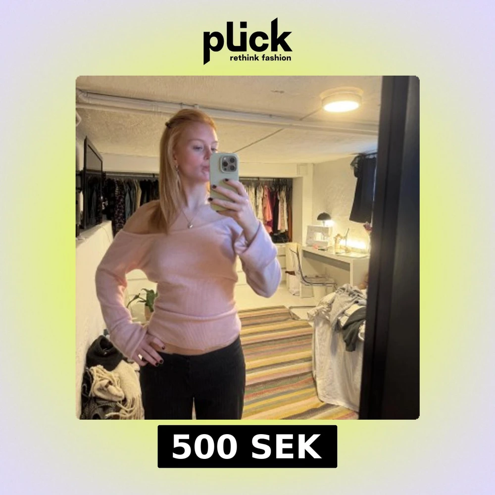 Säljer en snygg rosa Kashmir offshoulder tröja med ribbade detaljer. Perfekt för en trendig look. Tröjan har en tight passform och långa ärmar.