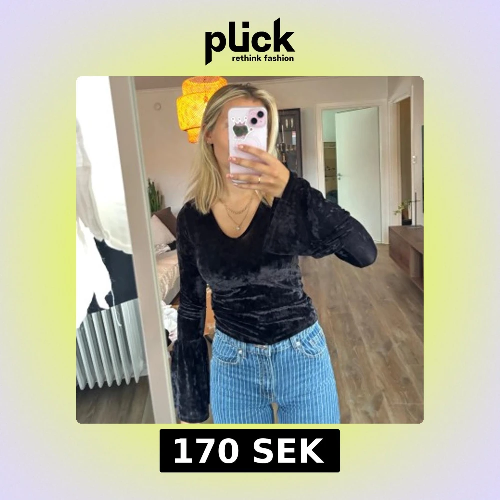 Svart sammetsblus med v-ringning och långa utsvängda ärmar.