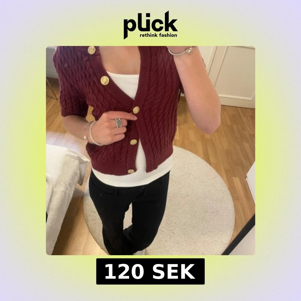 Säljer en snygg vinröd kofta med korta ärmar och dekorativa guldknappar. Koftan har ett flätstickat mönster och en v-ringad design. Perfekt för att lägga till en touch av stil till din outfit.