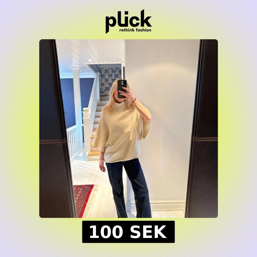 Säljer en beige stickad ponchotröja med polokrage. Tröjan har vida trekvartsärmar och en lös passform. Frakt spårbar PostNord tillkommer 59 kr.