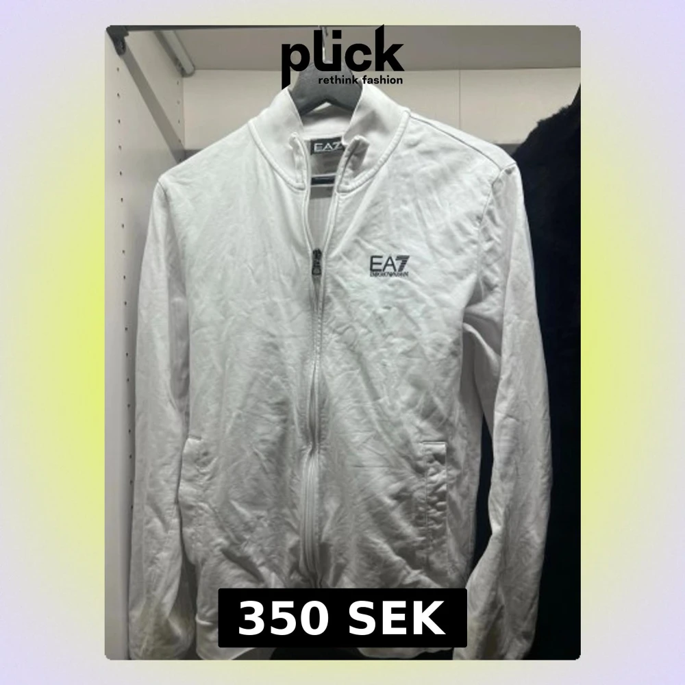Säljer en stilren vit ziptröja från EA7 Emporio Armani. Tröjan har hel dragkedja, ståkrage och två fickor framtill. EA7-logga på bröstet och diskreta svarta ränder i nacken. Perfekt till chill eller streetwear.