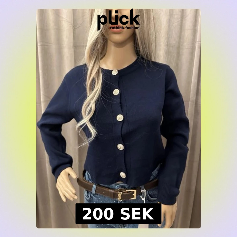 Snygg mörkblå kofta med rund hals och dekorativa guldiga knappar framtill. Koftan är stickad i ett mjukt material och har långa ärmar samt ribbade muddar vid ärmslut och nederkant. Perfekt att slänga över en t-shirt eller linne.