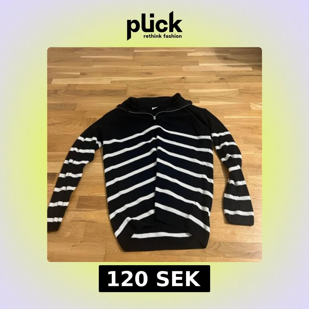 Svart stickad tröja med vita horisontella ränder och en snygg half zip-dragkedja vid kragen. Tröjan har lång ärm och ribbad struktur, perfekt för dig som gillar en klassisk men ändå chill look.