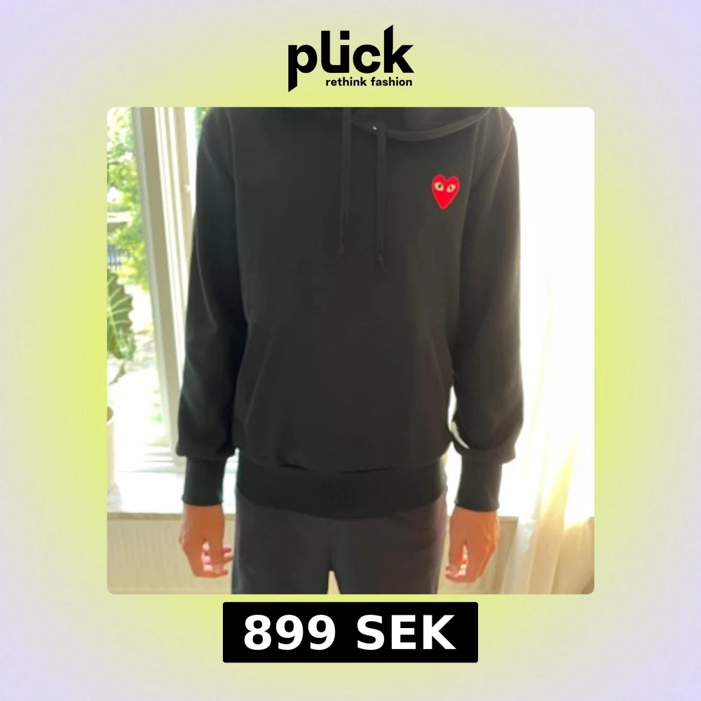 Svart hoodie från Comme des Garçons Play med det ikoniska röda hjärtat med ögon på bröstet. Tröjan har huva med snörning, magficka och ribbade muddar. Perfekt för dig som gillar streetwear och vill ha något stilrent men ändå med en twist.