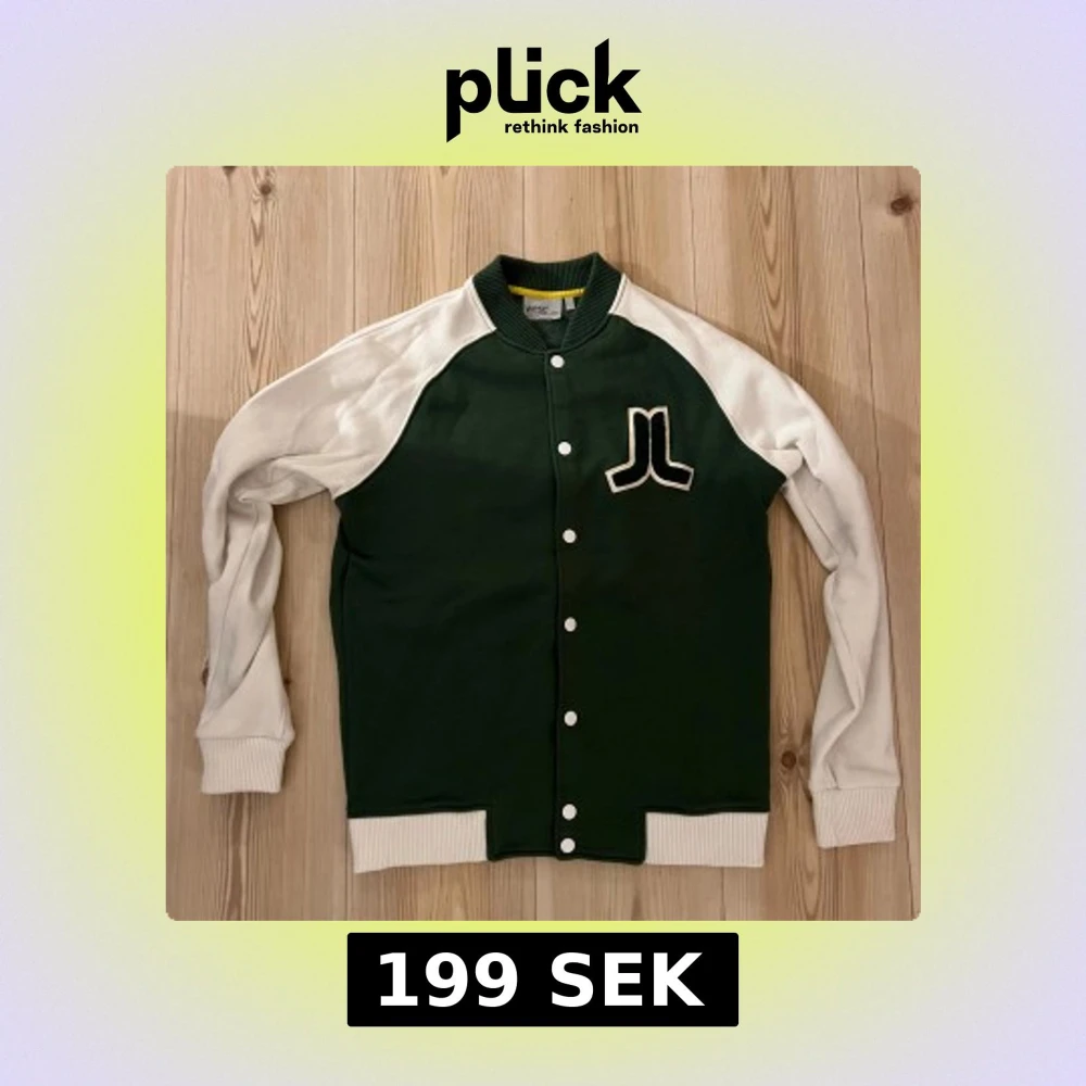 Säljer en snygg collegejacka från WESC i storlek small. Jackan är mörkgrön med vita ärmar och ribbade muddar. Framtill finns en vit logga och knappar hela vägen. Perfekt för dig som gillar streetwear och vill sticka ut med en klassisk varsity-look.
