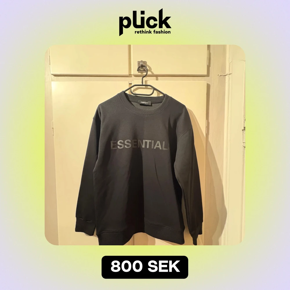 Säljer en stilren svart sweatshirt från Essentials. Den har en enkel design med texten 'ESSENTIAL' tryckt på framsidan. Tröjan är långärmad och perfekt för både vardag och avslappnade tillfällen. Passar bra till jeans eller träningsbyxor.