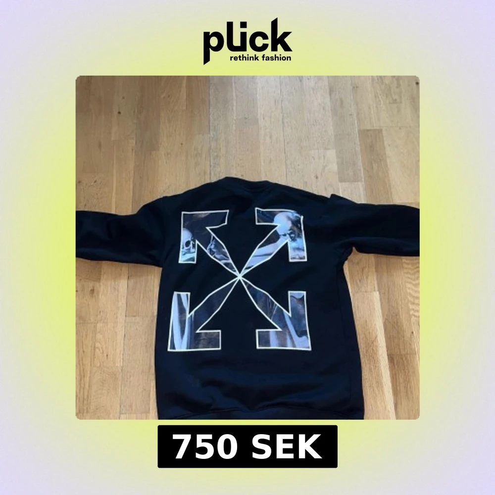 Svart sweatshirt från Off-White med stort grafiskt tryck i vitt och blått på ryggen och mindre logga framtill. Rund halsringning och långa ärmar. Klassisk streetwear-stil med mjukt bomullsmaterial.