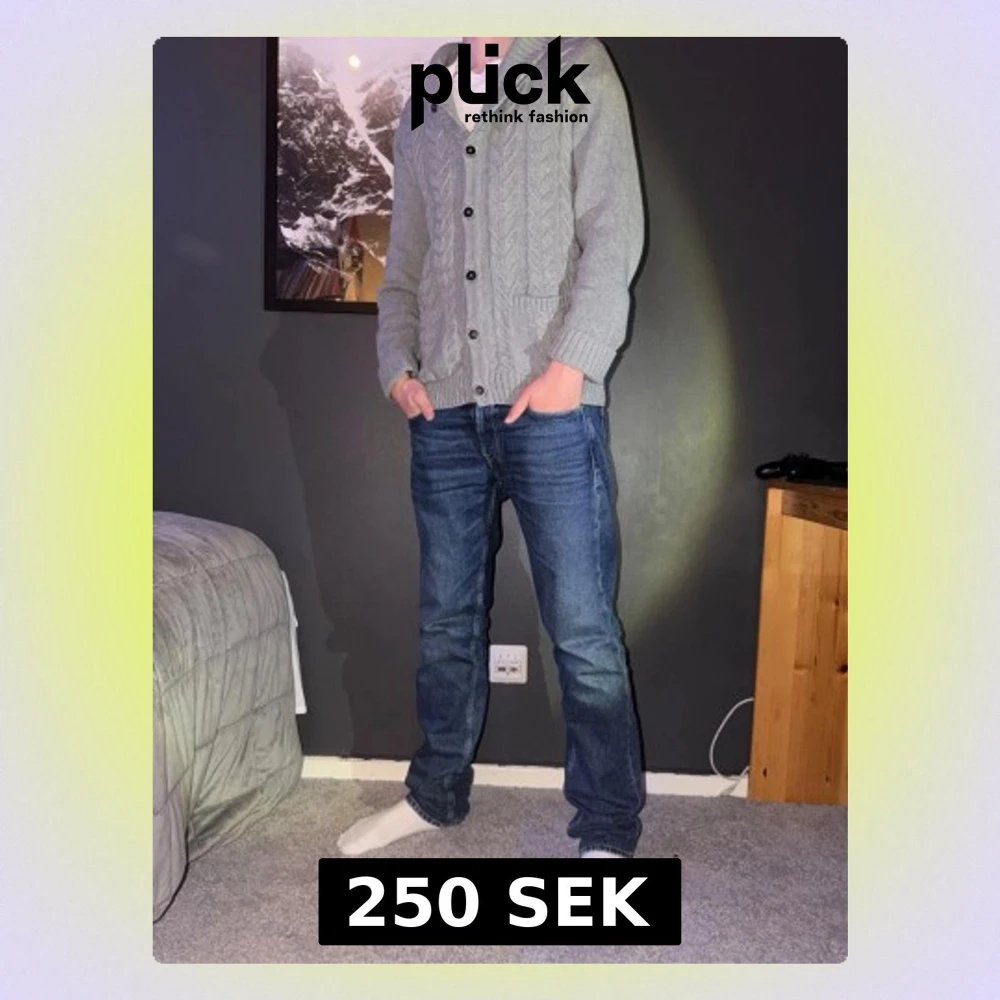 Grå stickad kofta. Går att köpa med ett par jenas för bättre pris. Inga tecken på användning. Storlek S men passar M. personen på bilden är 177