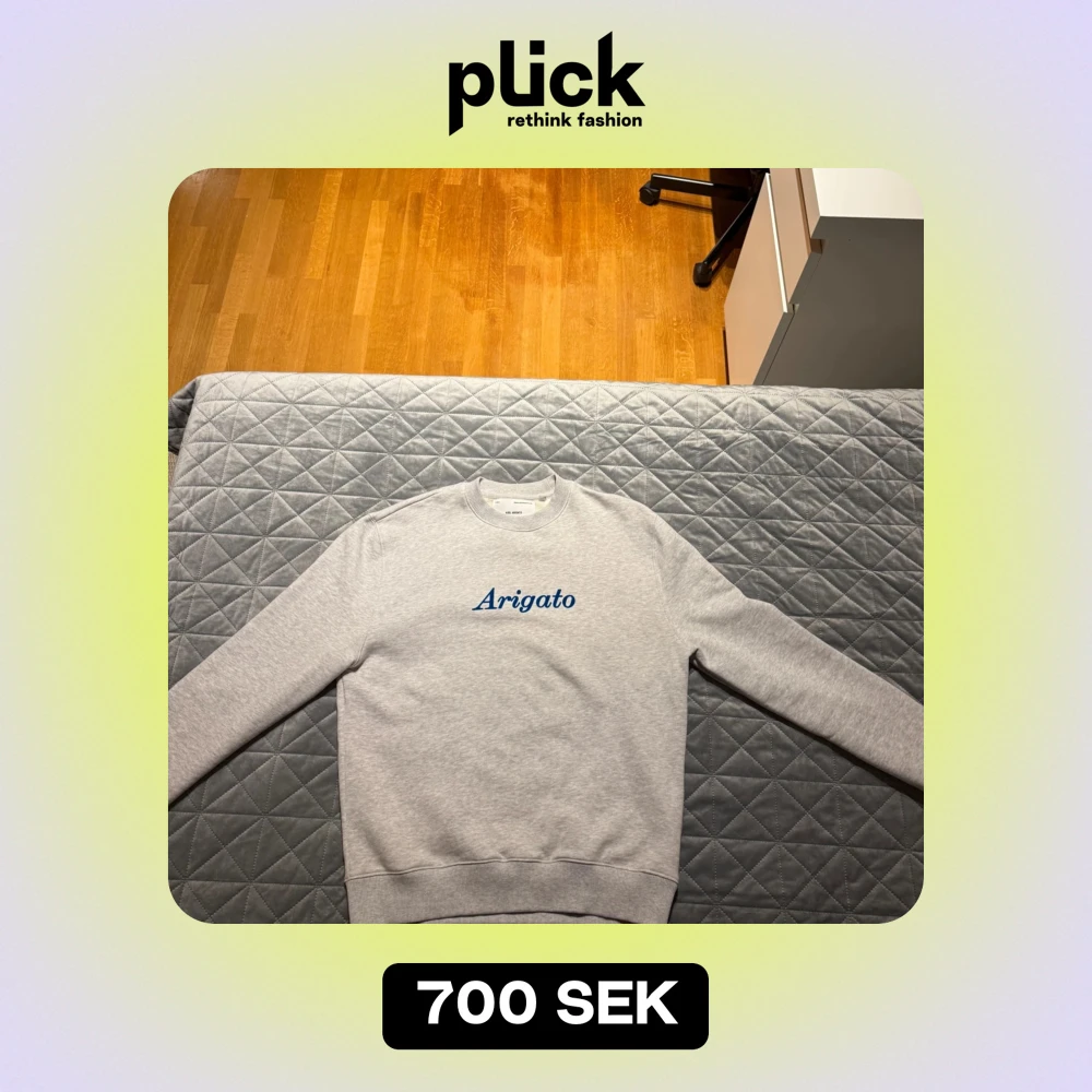Säljer en stilren grå sweatshirt med texten 'Arigato' i blått på bröstet. Tröjan har en klassisk rund hals och långa ärmar, perfekt för en avslappnad look. Den är i mycket bra skick och passar både till vardags och chillkvällar. Skön och enkel att matcha med det mesta!